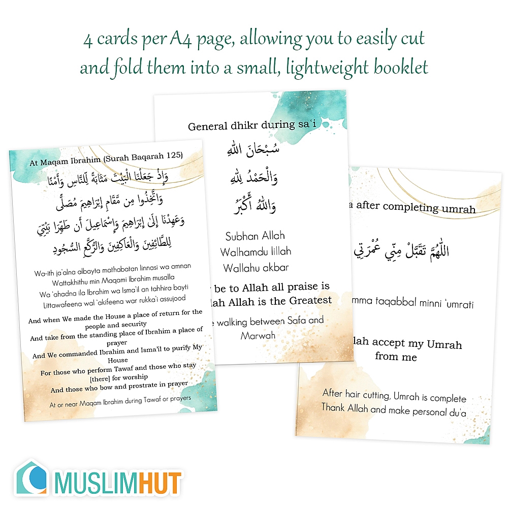 Designed with practicality in mind, the cards are formatted 4 per A4 page, allowing you to easily cut and fold them into a small, lightweight booklet that fits perfectly in your hand or bag for easy carrying during Umrah 📖